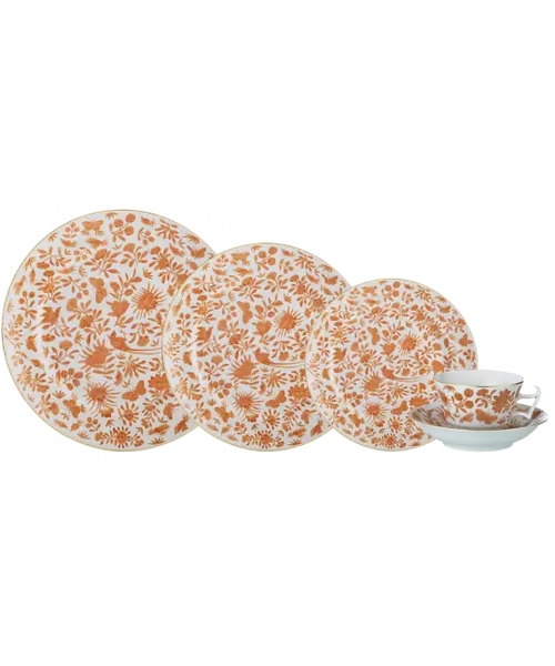 The Sacred Butterfly was a Chinese export pattern of about 1800 and was intended for those who admired the sophistication of placing traditional Chinese motifs of birds, butterflies and flowers on European shapes. The Chinese word for butterfly, tieh, is a pun which expresses the wish that the owner might live to a ripe age. These motifs were rendered with characteristic understatement in the traditional Chinese orange and gold colors in an all-over pattern. The marriage of shape and design was a success and was reproduced in English china of about 1800-1810. Our reproductions are based on originals in Historic Charleston. Dishwasher safe.